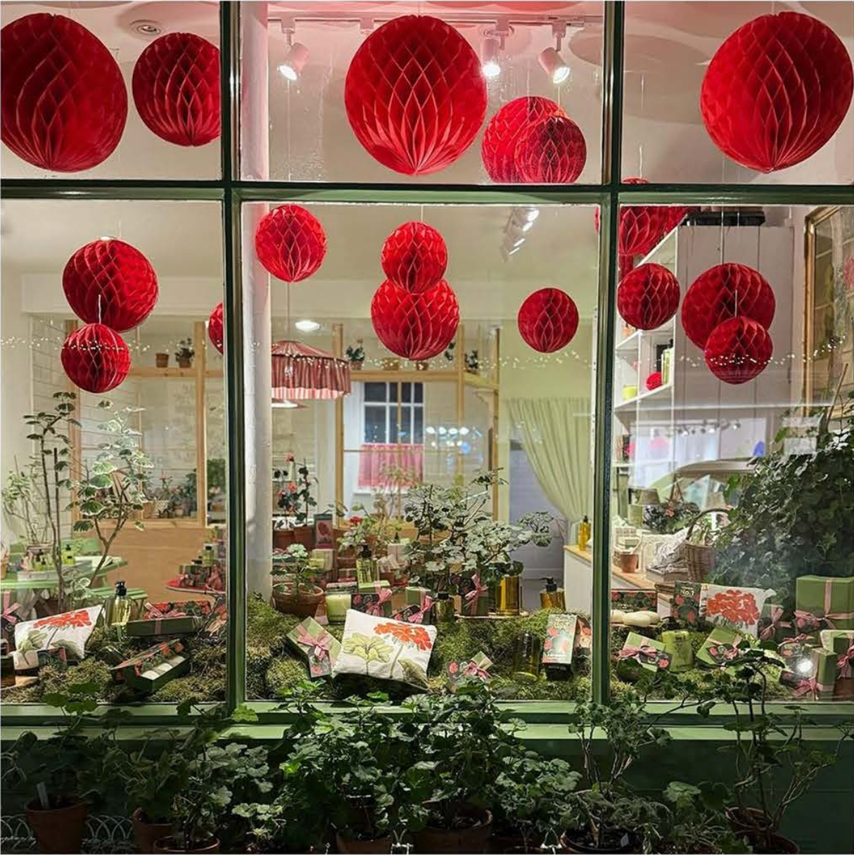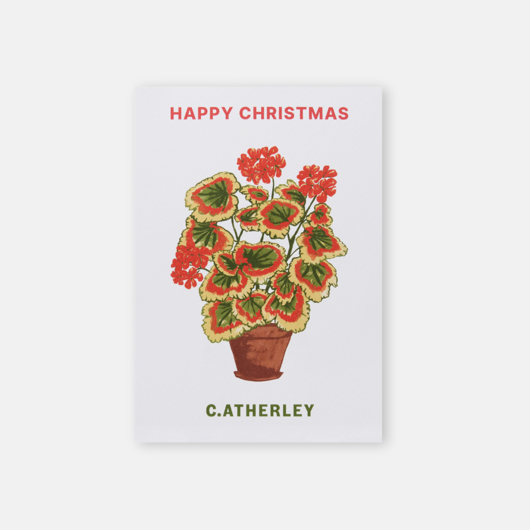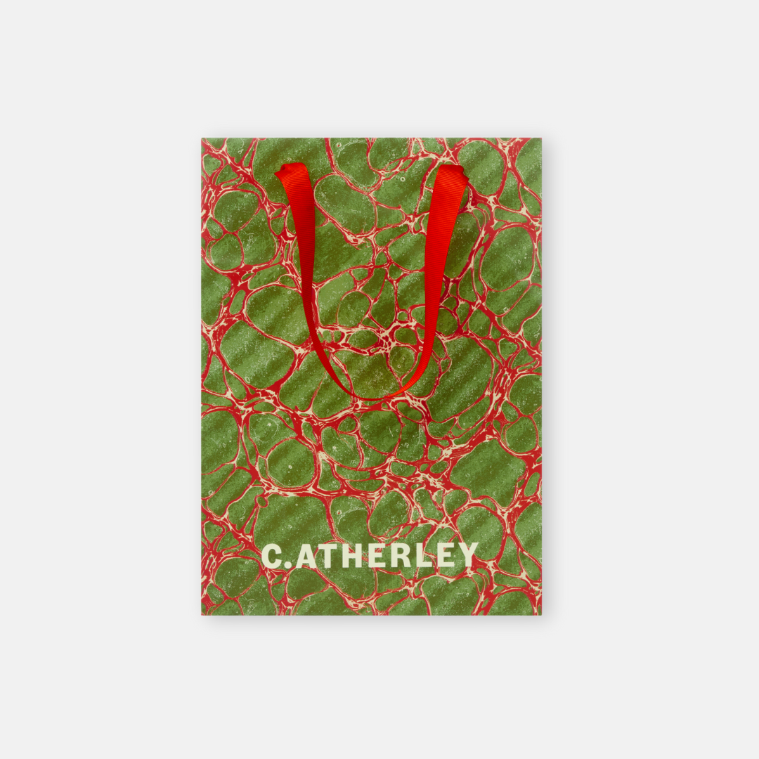 Inspired by a beautiful piece of marbled paper from Cath's print archive, our design team painted up a new design for our seasonal boxes. The bright red, pink and green are inspired by the natural colours of some of our favourite geraniums. Don't forget to add this bag and matching card to your Christmas shopping to make sure you're all set and ready to go.