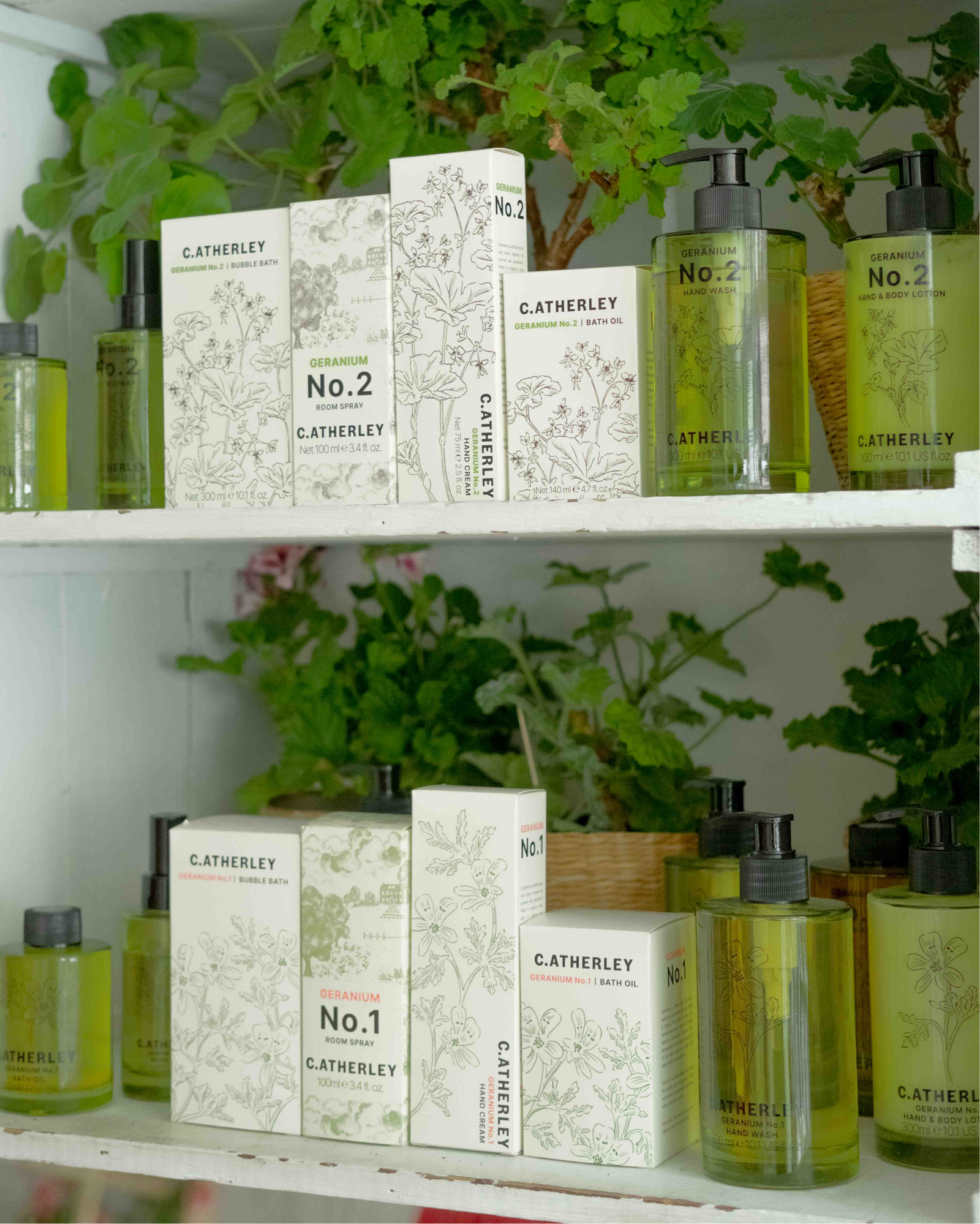 The story of C.Atherley began in 2016 when our founder Cath Kidston Padgham stepped away from work at her eponymous brand. After years of commuting, she found she had lots of time to spend in her garden at home in the Cotswolds. She treated herself to a greenhouse, something she had always longed for, and set about growing a collection of geraniums, a plant she had loved since childhood. She was interested in the scented leaf pelargonium varieties and in particular learning about the extraordinary properties of these plants, each with their own distinctive fragrances. It turned out to be a strangely peaceful and uplifting time.