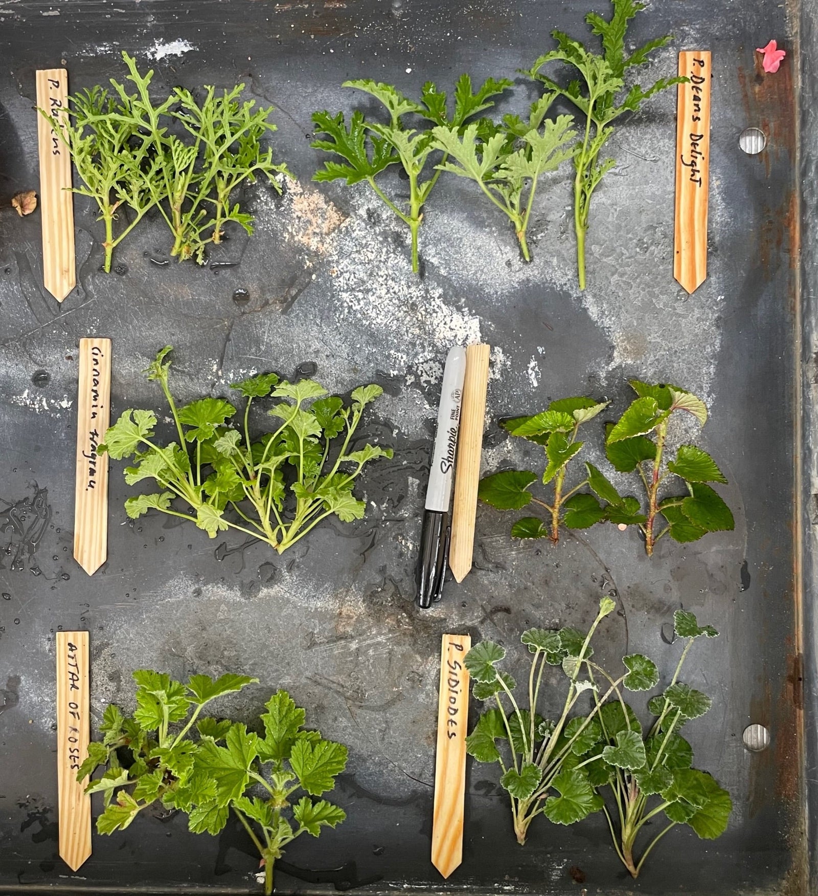 For those who are not familiar with scented leaf pelargoniums (often referred to as scented leaf geraniums), their flowers have no scent, but their leaves, when rubbed or touched, release and emit an extraordinary array of fragrances. The plants have very decorative leaves and small, usually pale pink, lilac, or lavender flowers, but it is the fragrances that are used for a variety of purposes, in perfumes, aromatherapy, body care products, and insect repellent. They are also popular in teas and recipes. Within the species, the following common scents can be found: